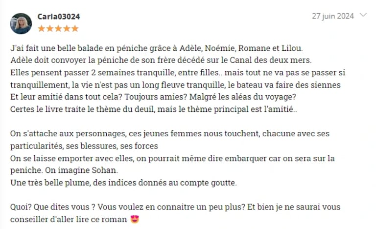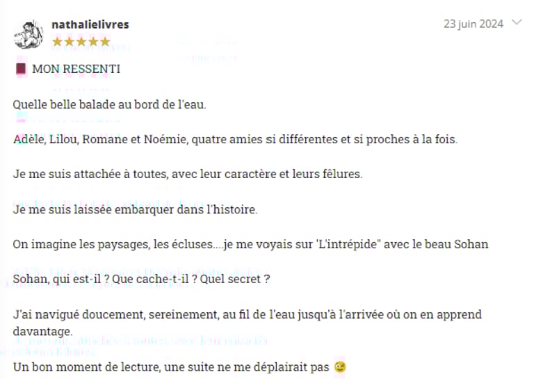 Heureusement, le voyage leur réserve une surprise intrigante : le mystérieux Sohan vient leur prêter main-forte. Lilou s’en méfie, Noémie n’ose pas l’entreprendre, Adèle relève qu’il connait un peu trop bien la péniche de son frère et Romane le trouve très à son goût. Bref, il ne laisse aucune des jeunes femmes indifférentes.